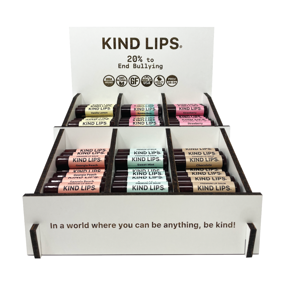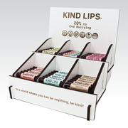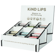The display is ideal for high-traffic areas, creating a visually appealing centerpiece that draws attention while showcasing the quality and purpose behind Kind Lips. Every purchase from this display supports our Kind Lips in the Classroom initiative, helping to empower children with the message of kindness across the nation.
